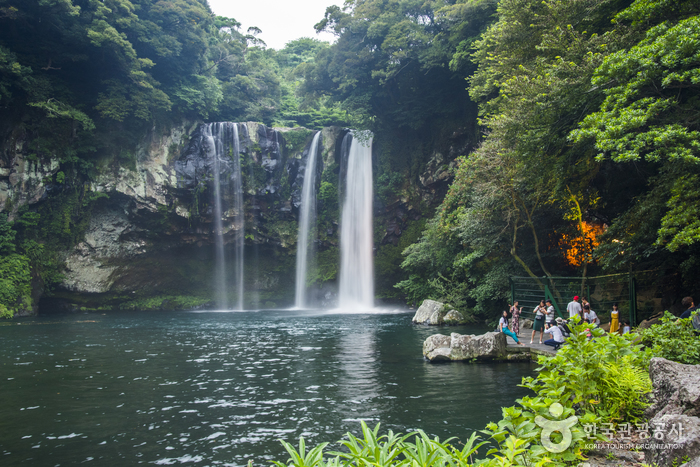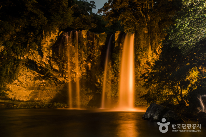 从奇岩峭壁上伴着天雷轰鸣声湍流而下的白色水柱就是天地渊瀑布,其名字带有天地相遇之意。天地渊的山涧中,不仅有自然遗产第163号的胆八树自然生态林,还生长着野草莓、松叶兰等珍稀植物。此外,这里还有自然遗产第379号天然植物林,林中的长尾尖叶櫧、山柚子树、冬柏树等温带树木郁郁葱葱,非常繁茂。沿着天地渊温带树林徒步行走1公里左右,就会听到惊天动地的瀑布滑落之声,白色的瀑布仿佛银河落九天,非常壮观。整个瀑布宽12米,高22米。瀑布下的潭水深20米,水质清澈无比。天地渊被指定为自然遗产第27号,潭中盛产鲈鳗鱼(这里的鲈鳗鱼被指定自然遗产第258号)。